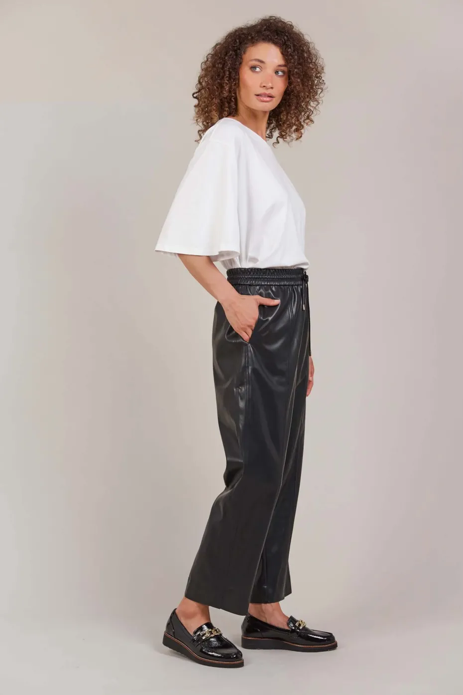 With a fully elasticised waistband, adjustable drawstring, and practical inseam pockets, the Allegro Crop Pant offers a versatile statement piece for your winter wardrobe. The straight-leg design and matte faux leather finish give it an understated yet glamorous edge. Perfect for a day spent exploring galleries, style it with a t-shirt, cosy cardigan, and loafers.
