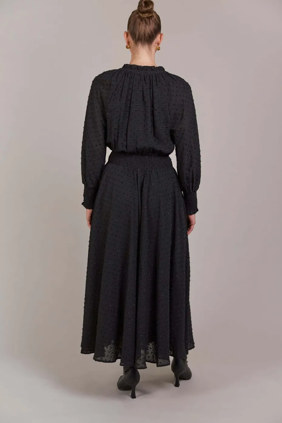 Shine bright in the Ayana Maxi Dress! Its shimmering lurex detailing catches the light and draws attention, making it a standout choice for any celebration. The dramatic sleeves, shirred waistband, and flowing A-line skirt create a bold yet feminine silhouette. Paired with strappy heels or boots and bold metal accents, this look is sure to earn you all the compliments!