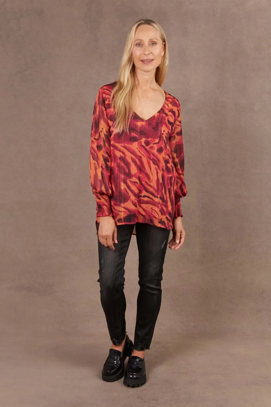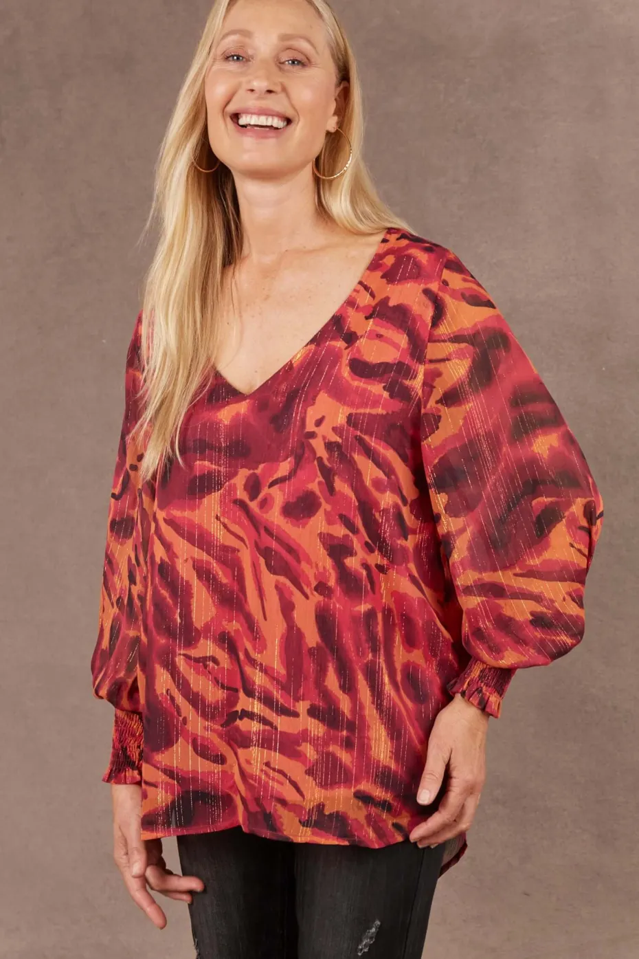 Dazzle at your next event with the Bantu Top, an exquisite sheer number threaded with shimmering lurex. Its flattering neckline, sheer bishop sleeves, and relaxed hem promise instant glamour. Complete the look with leggings, boots, and statement accessories for a sophisticated ensemble that captures attention and radiates evening allure.