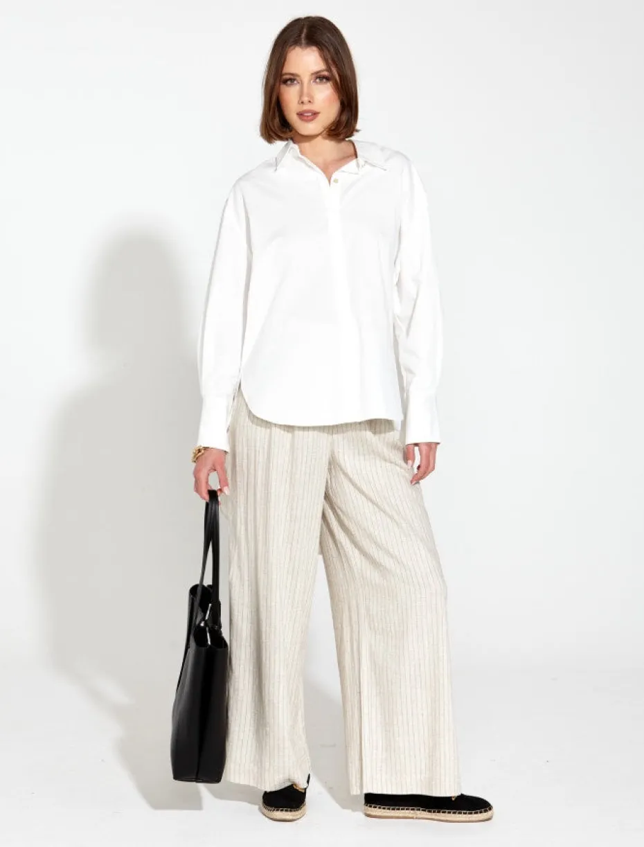 Elevate your wardrobe with our Landline Oversized Shirt. Featuring a classic traditional collar and adorned with exquisite gold button details, this shirt exudes timeless charm. The sleeve cuffs, accentuated with two gold buttons, add a touch of sophistication to your look. Effortlessly chic and versatile, this oversized shirt is a must-have piece.