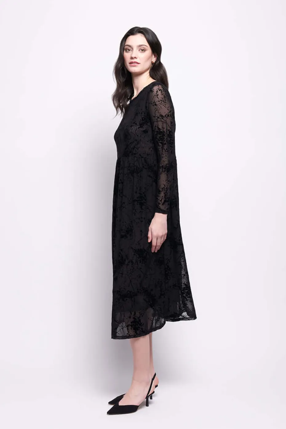 Burnout velvet on mesh, round neck dress with tiered skirt. Velvet splatter print.