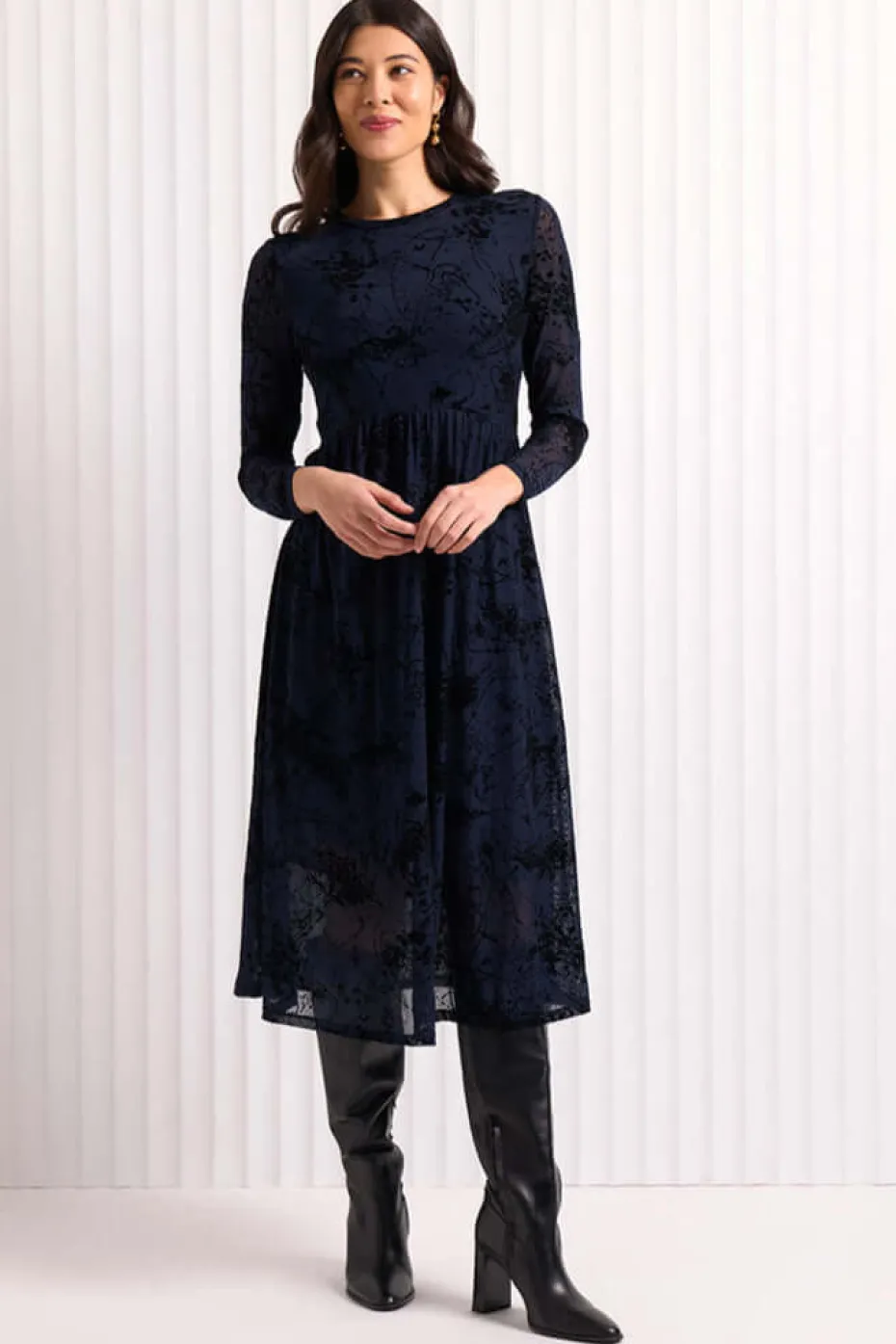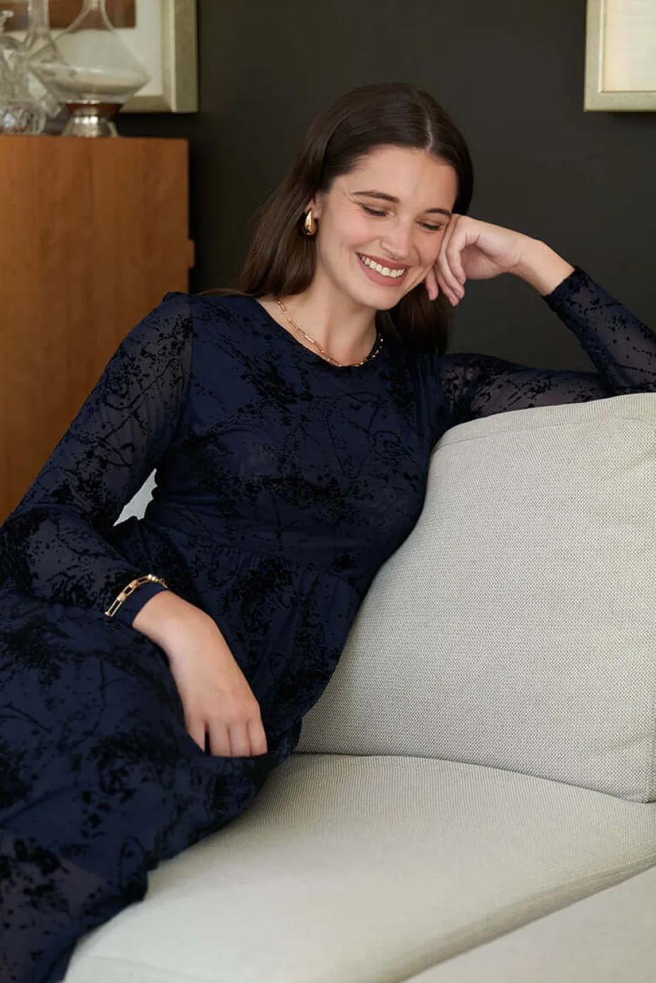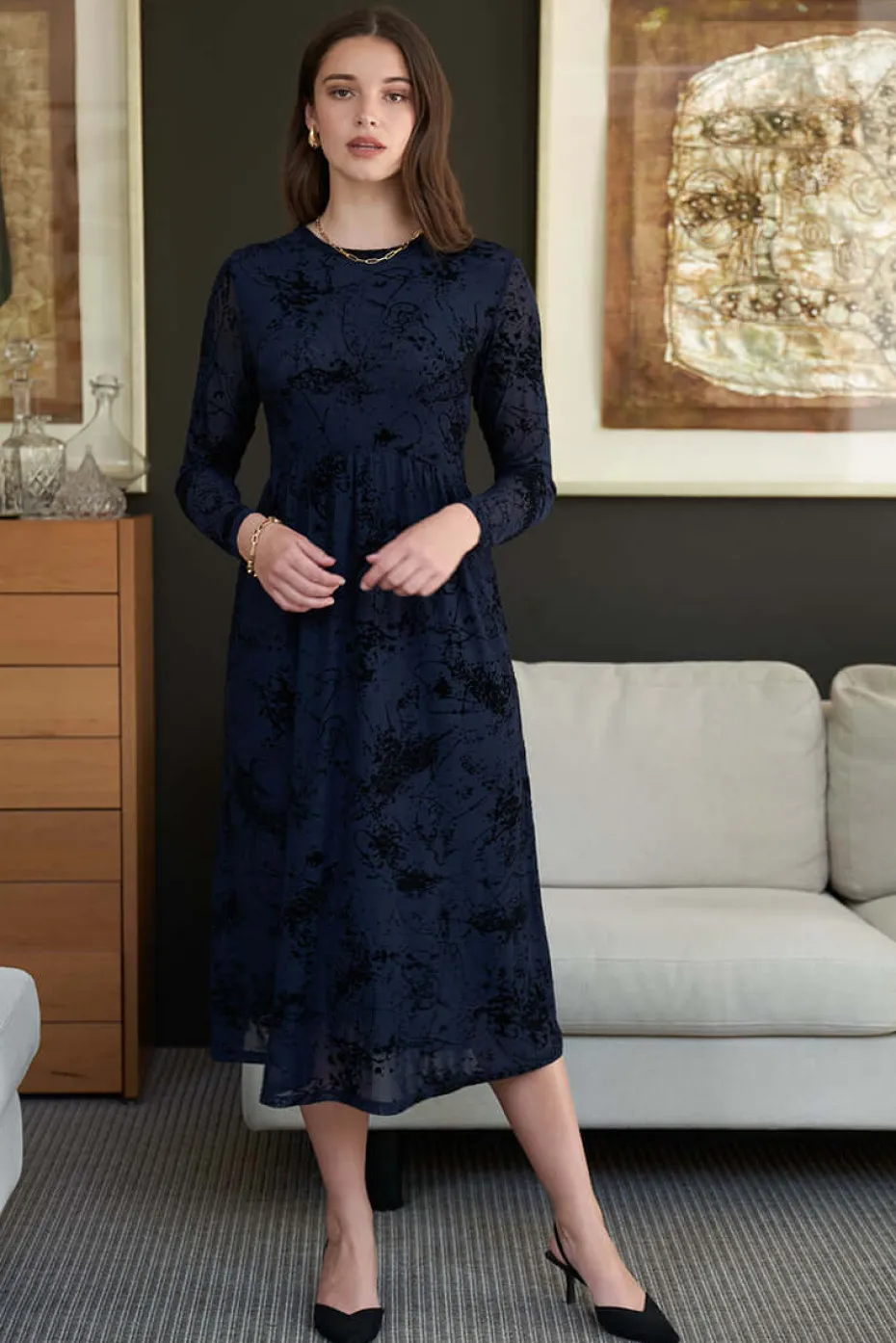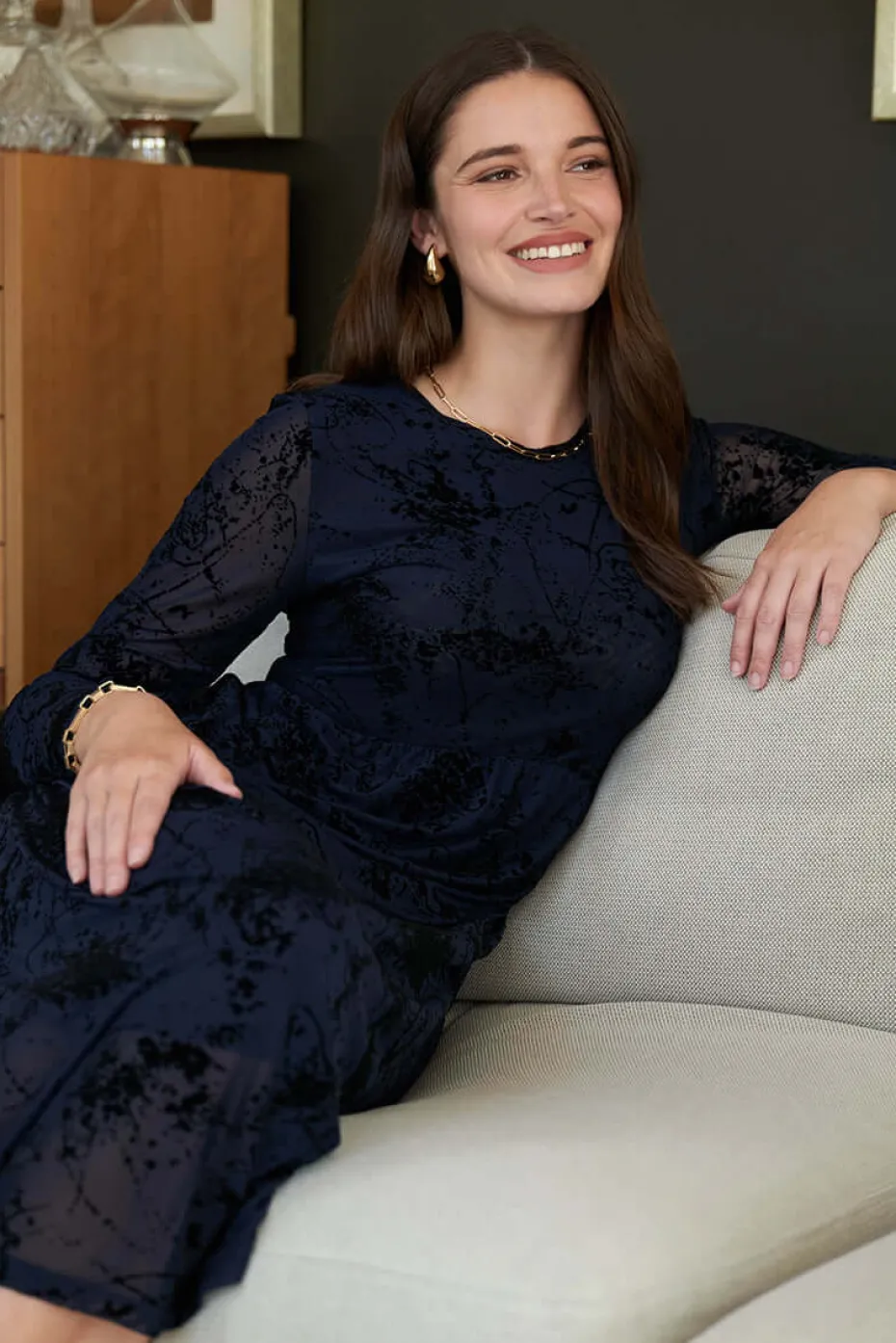 Burnout velvet on mesh, round neck dress with tiered skirt. Velvet splatter print.