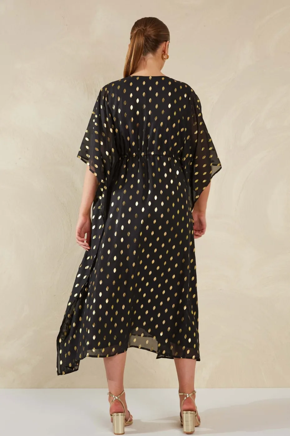 The Sanremo Kaftan radiates the charm of a luxurious Mediterranean getaway. Floaty and feminine, this kaftan brings a touch of elegance to your summer style. It showcases a flattering V-neck, sheer kimono sleeves, an adjustable drawstring, and a dainty handkerchief hem. The lovely gold foil patterning creates a stunning contrast against its neutral tones. Style it with heeled sandals and metallic arm candy for a glamorous ensemble.