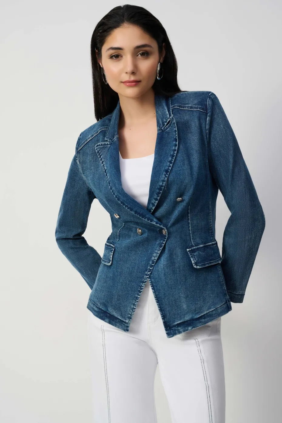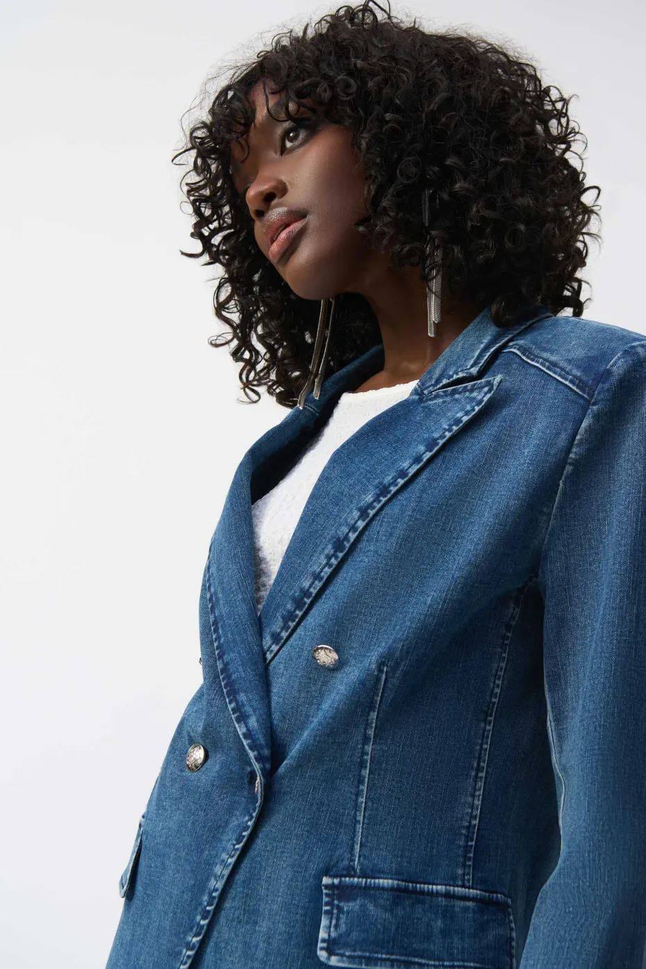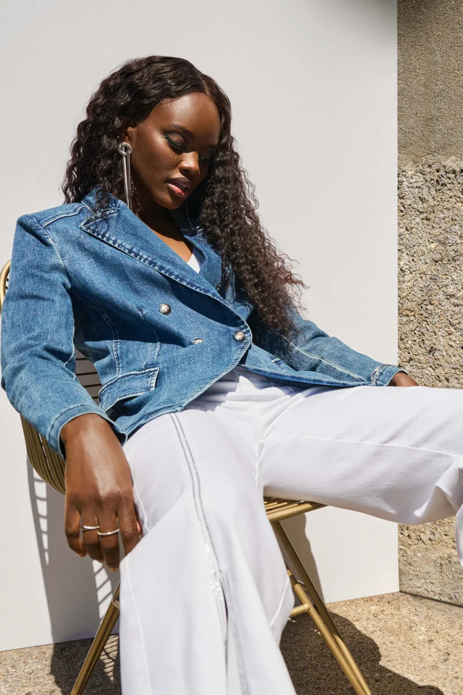 Cut from a stretch denim fabric, this double-breasted blazer offers an unexpected blend of structure and casual style that’s next level. Designed with a classic lapel collar, faux-pocket flaps, and military-inspired buttons, you’re sure to feel relaxed yet confidently put together.