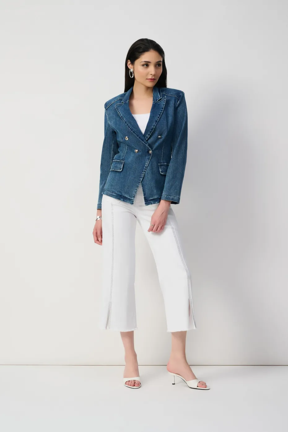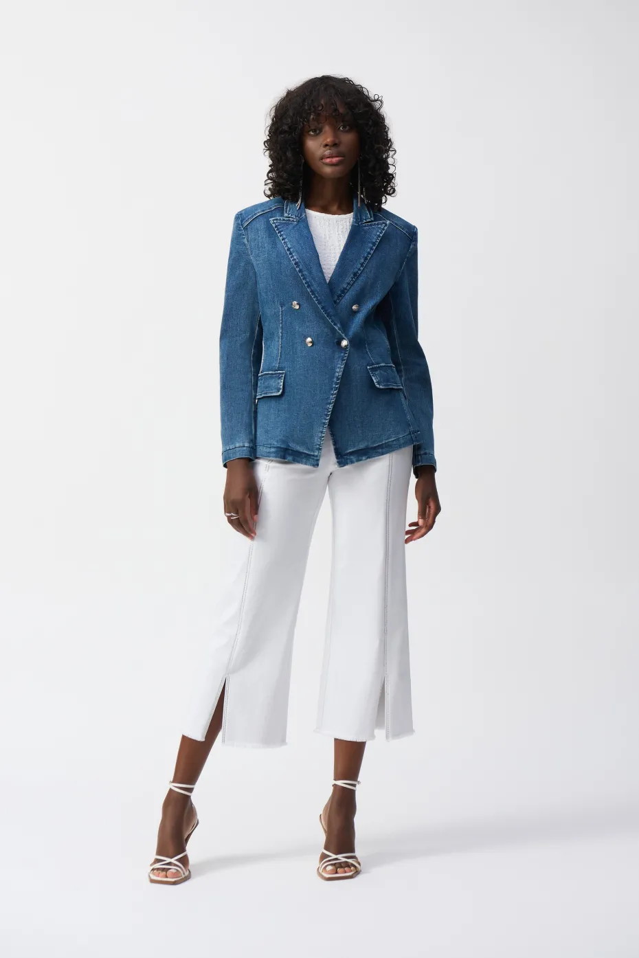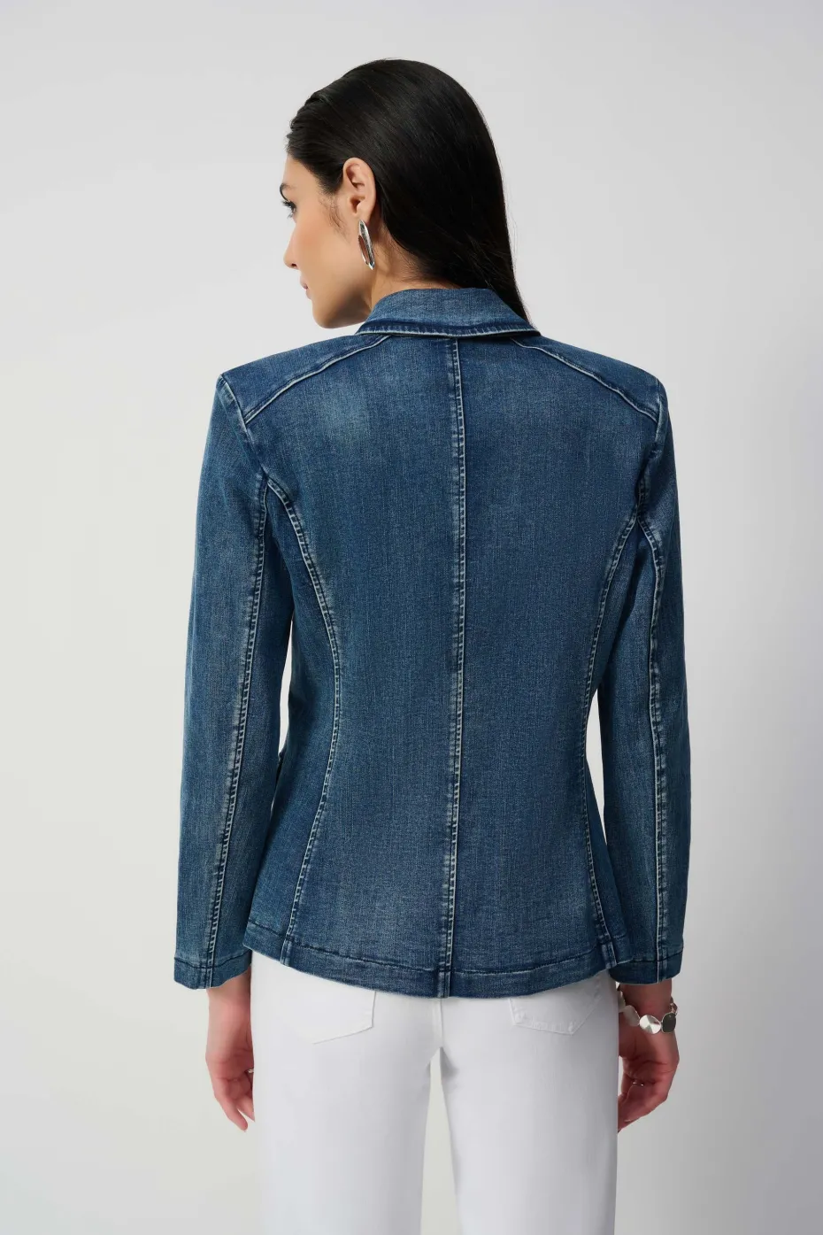 Cut from a stretch denim fabric, this double-breasted blazer offers an unexpected blend of structure and casual style that’s next level. Designed with a classic lapel collar, faux-pocket flaps, and military-inspired buttons, you’re sure to feel relaxed yet confidently put together.