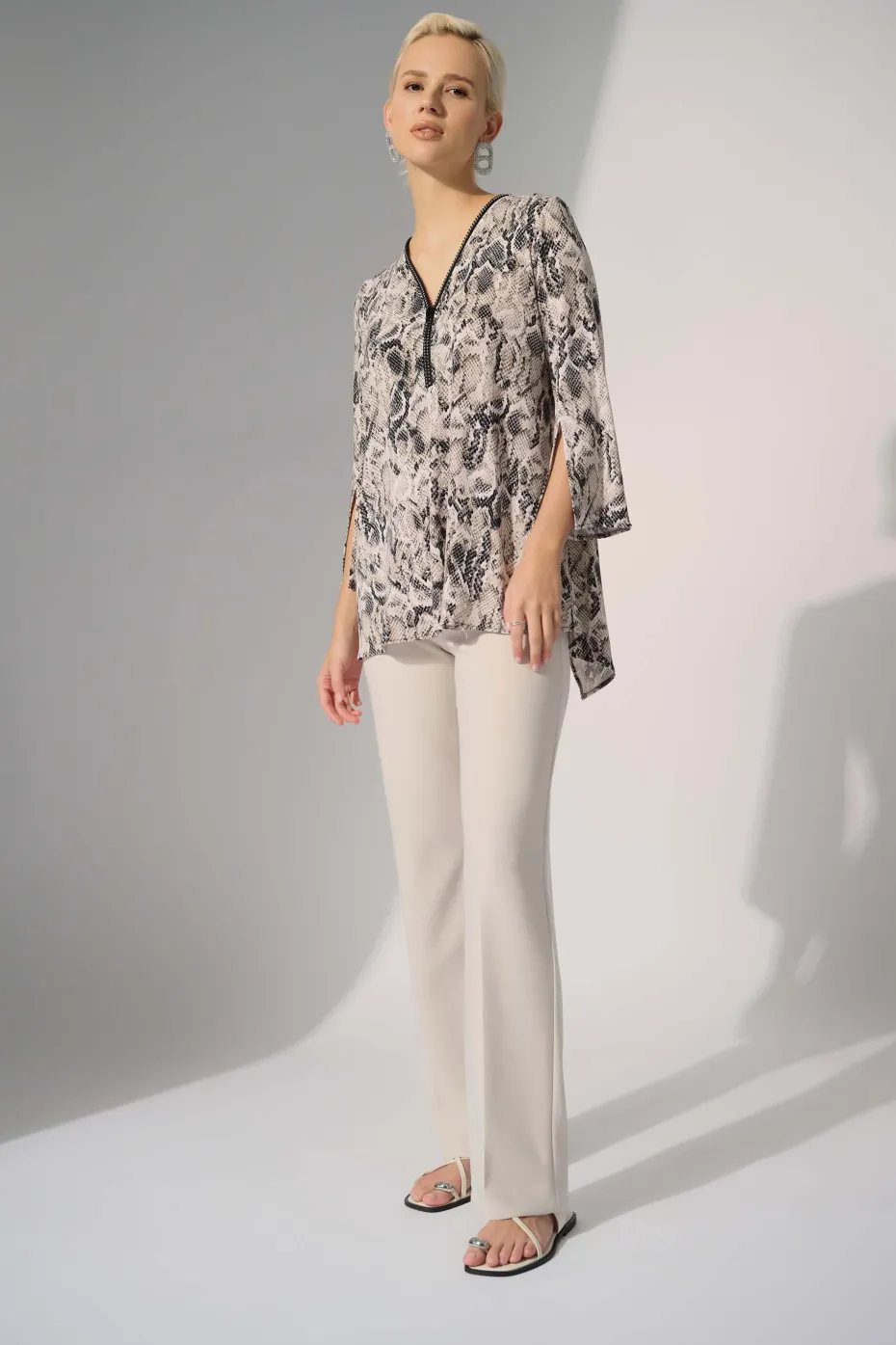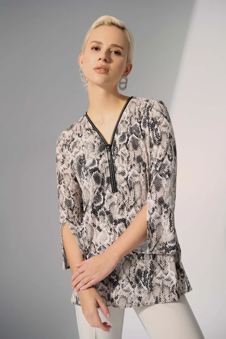 Destined to enliven your outfit, this tunic top features a bold python print and a rhinestone zipper neckline for a touch of flair. The flattering fit-and-flare silhouette enhances your shape, while slits at the sleeves and a back overlay add refined details that elevate the design even further.