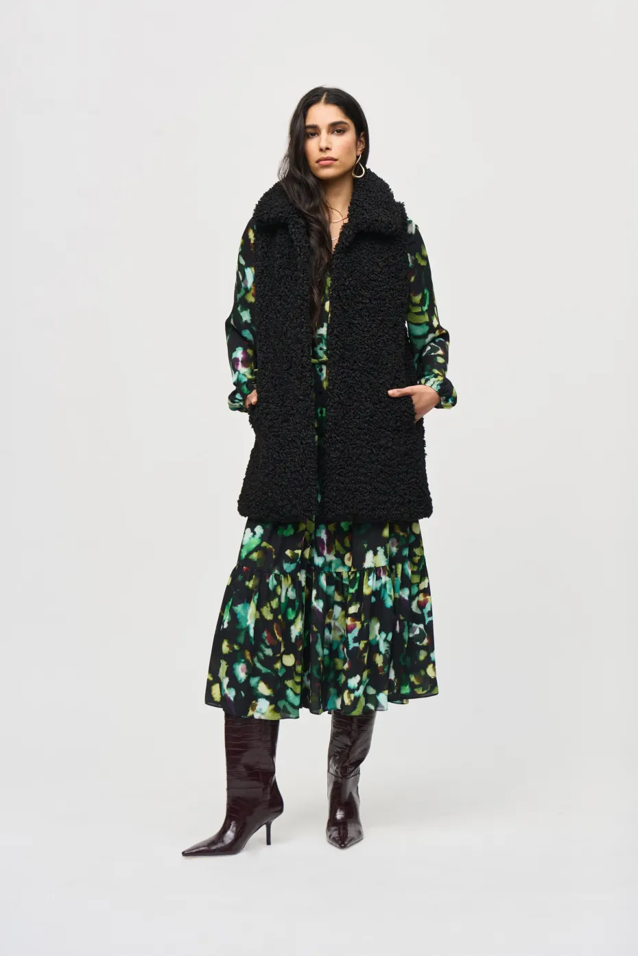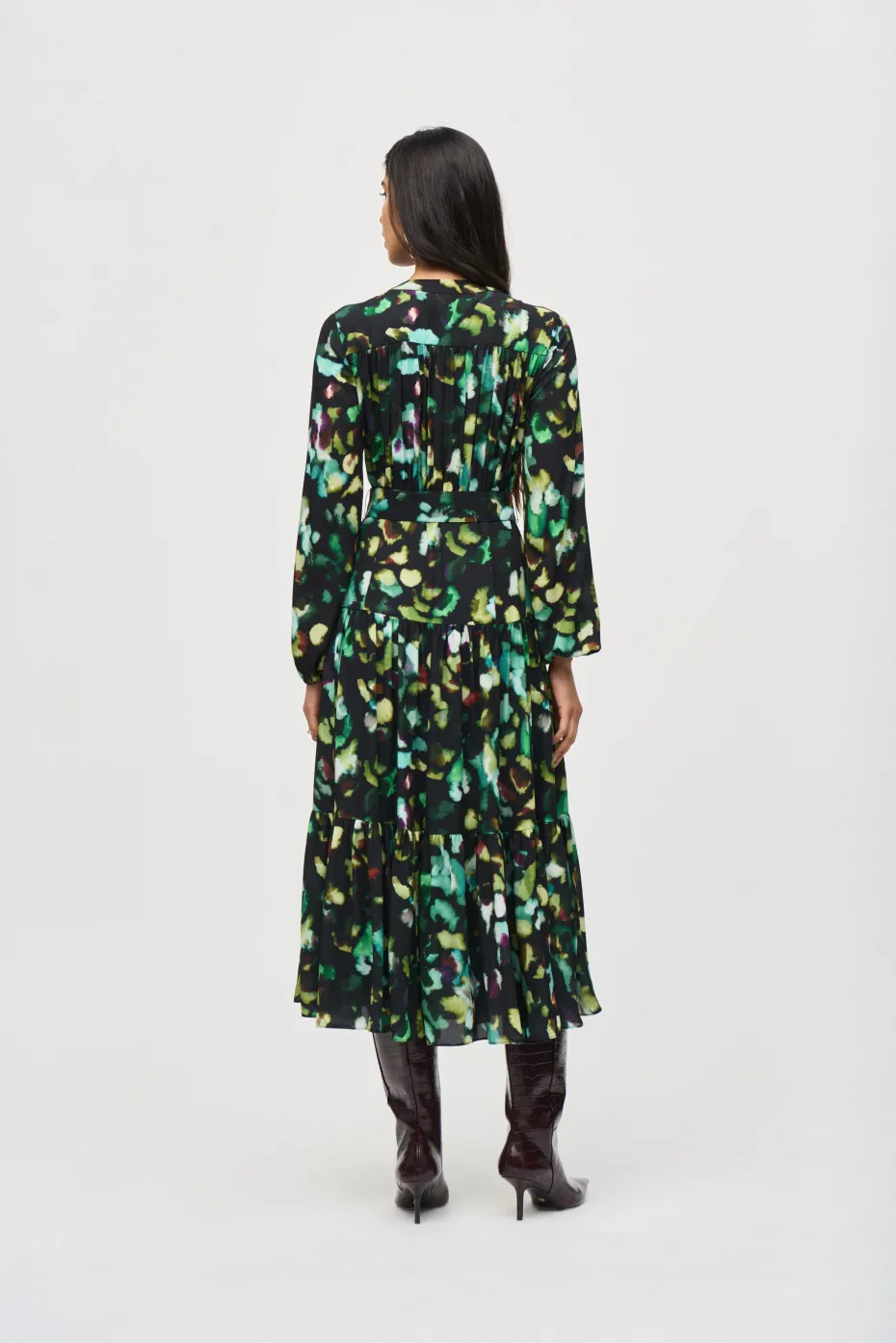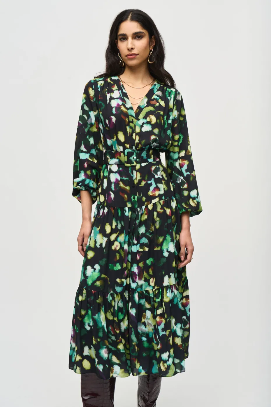 An alluring abstract print, flowing georgette fabric, and puffed sleeves come together to create a lovely dress for a special occasion or dinner out. The tiered skirt creates movement while the matching belt accentuates your figure.