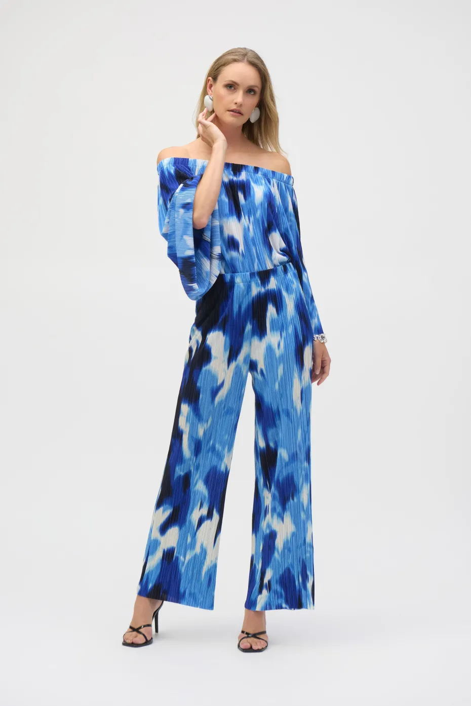 With its alluring off-shoulder neckline and striking tropical print, this flared top is pure vacation vibes; all that’s missing is a mocktail. Three-quarter bell sleeves enhance its relaxed charm, while the pleated novelty fabric adds a subtle touch of texture.