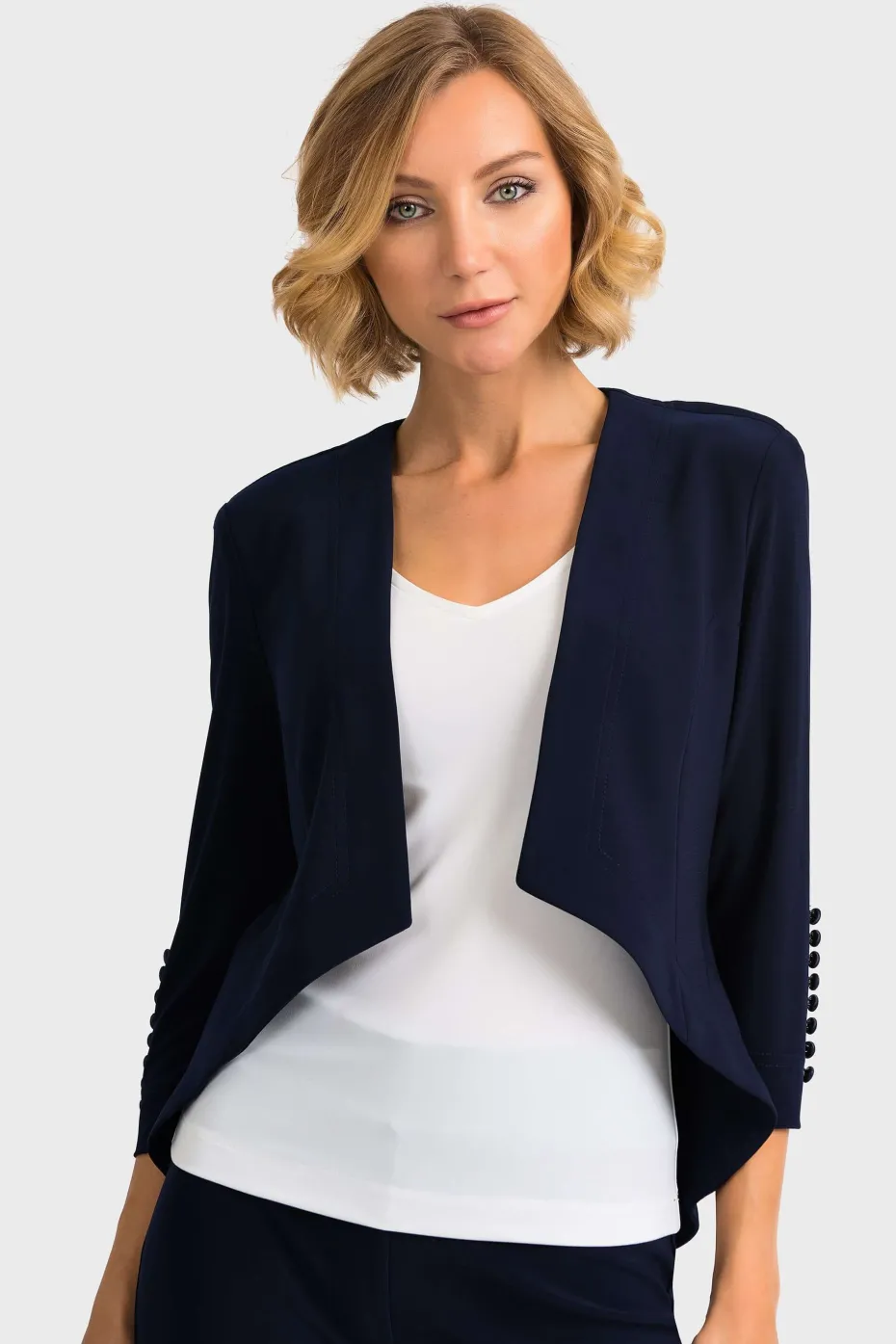Sharply-styled tux overpiece that offers clean lines and timeless sophistication. The cropped front pulls in pointedly at the waist while the back falls below the hips, accentuating its figure-hugging fit. Covered buttons adorn the three-quarter sleeves.