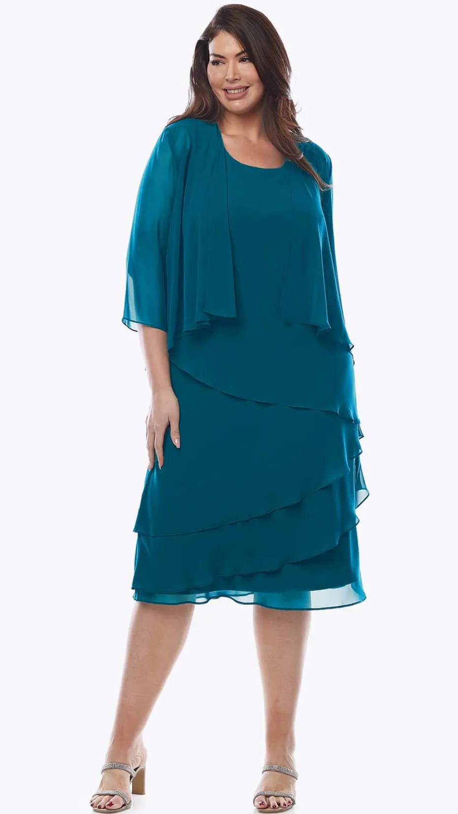Layered chiffon dress with a matching shrug style jacket.