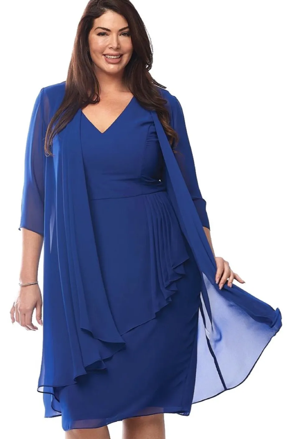 Fitted chiffon dress with waterfall draping on side, teamed together with longline jacket.