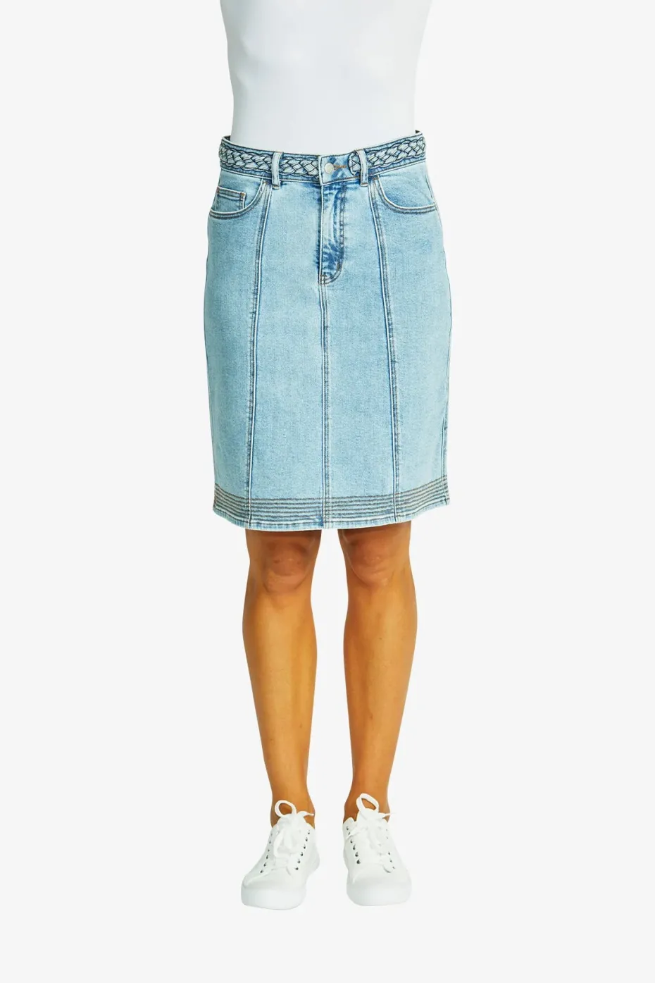 Stretch denim skirt with braided detail waist band u0026amp; top stitched hemline detail.