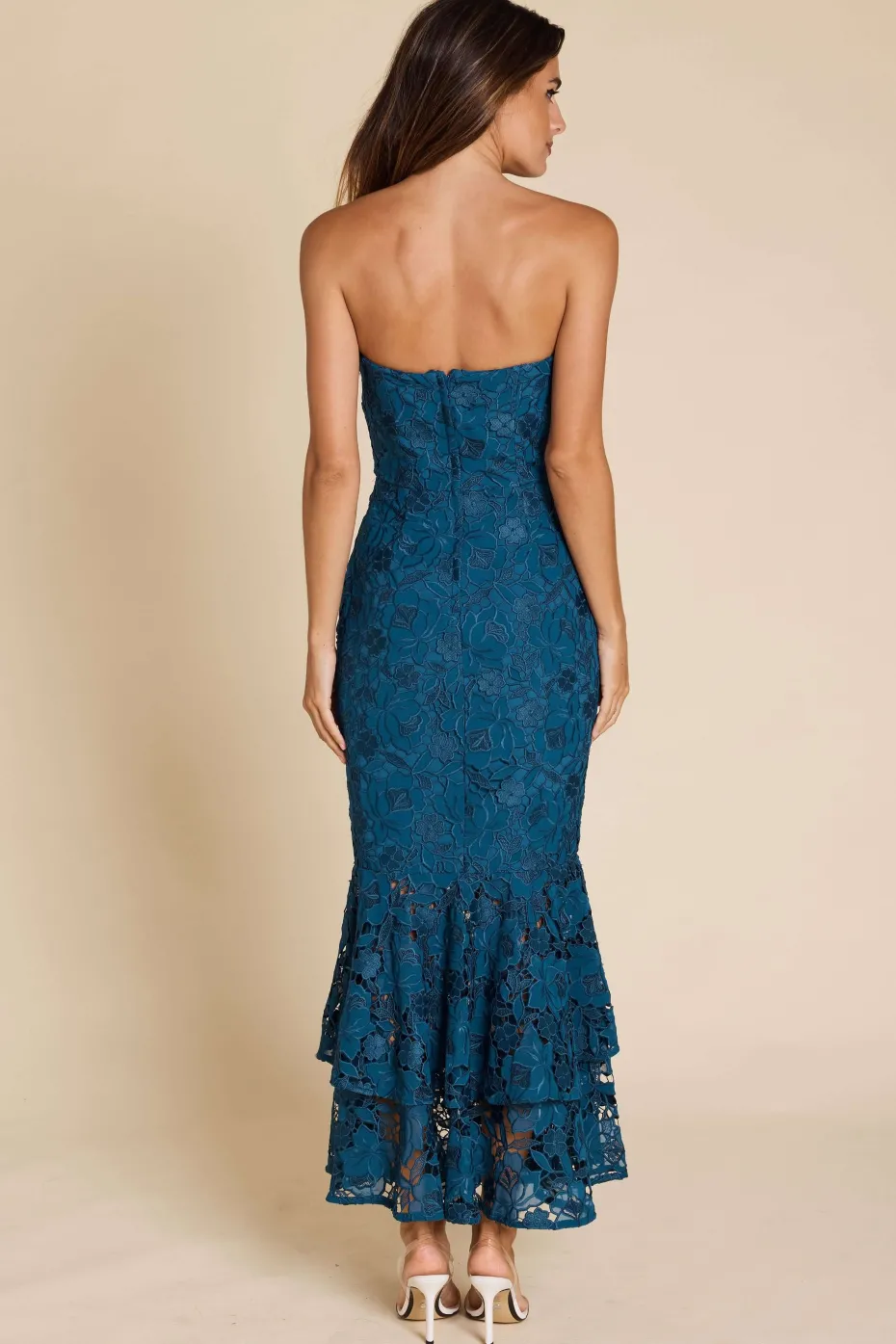 Elegant strapless gown in indigo lace over indigo lining, fitted waist band and doulble frill hemline.