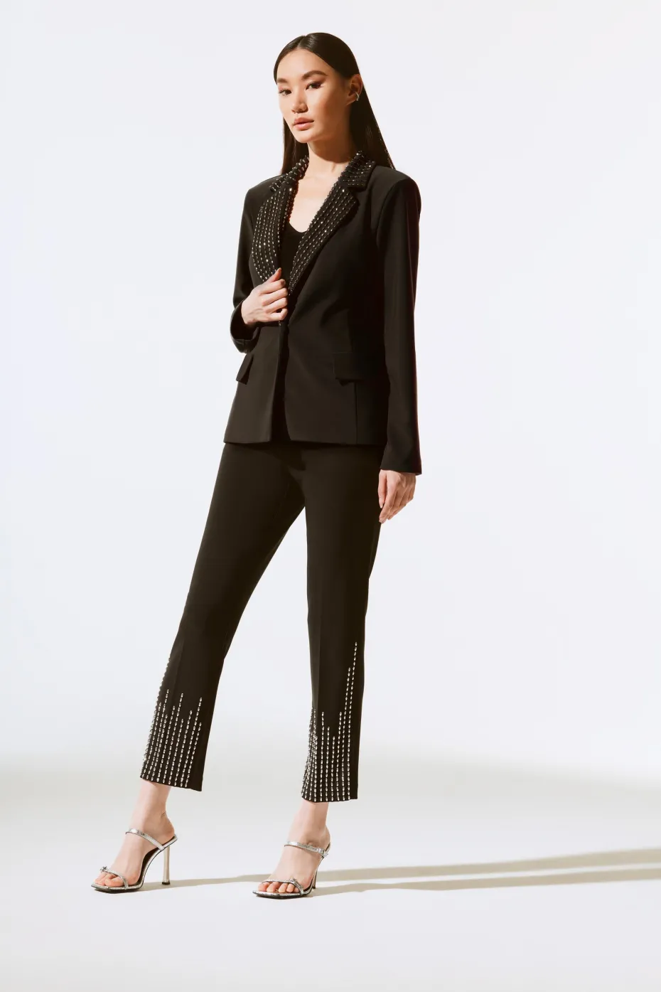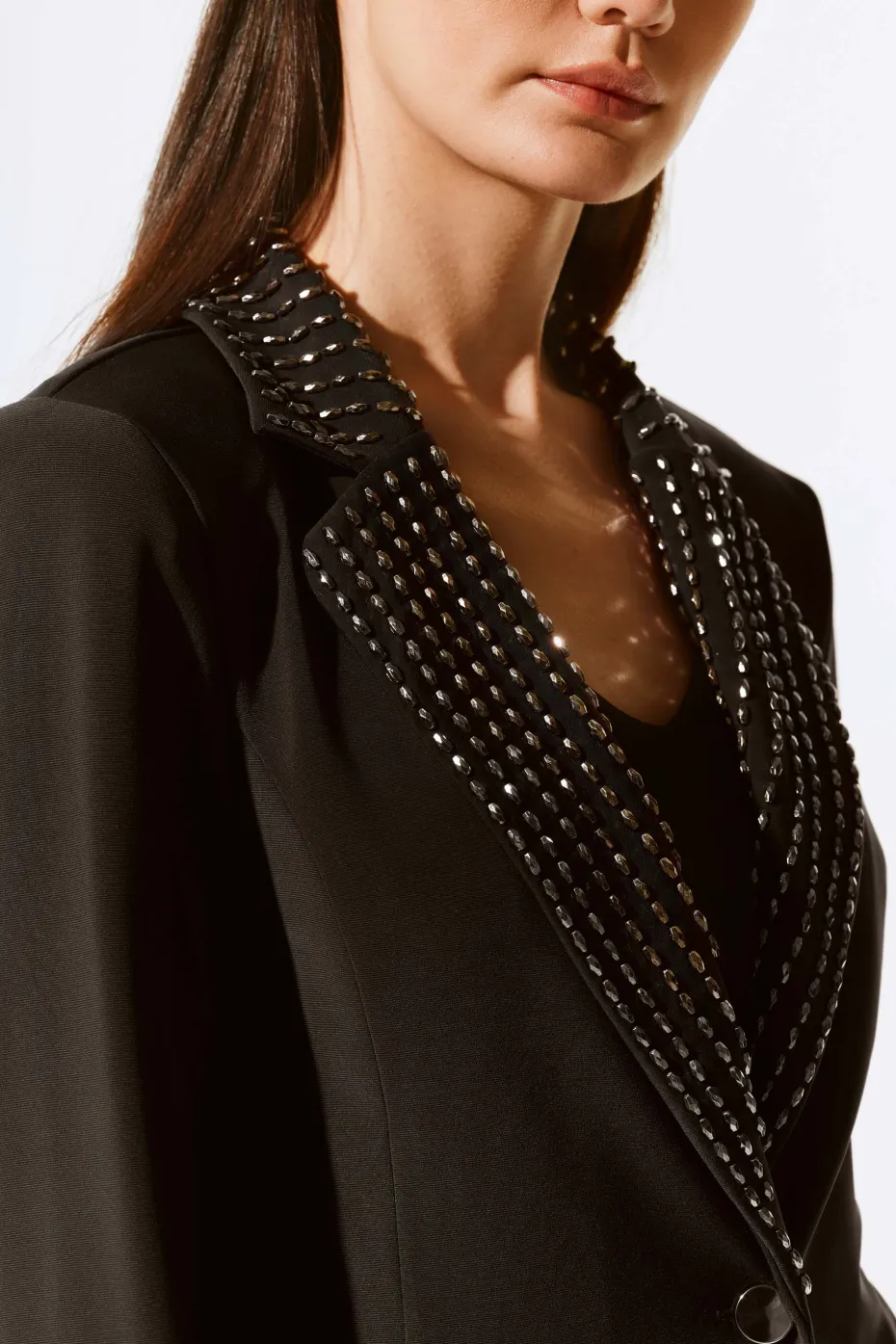 Embrace the perfect blend of comfort and poise in this exquisite silky knit blazer. The garment is adorned with intricate beading along the notched collar and lapels, a beautiful display of subtle elegance. The single-button front closure and faux pocket flaps create a streamlined, polished look, while the classic long sleeves and fitted silhouette exude confidence and sophistication.