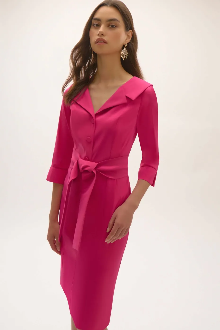 Sophisticated yet playful, this stretch taffeta dress has it all. The tailored notched collar and three-quarter cuffed sleeves exude elegance, while the large sash belt adds a fun twist. The covered front button placket ensures effortless wear, and the sheath silhouette flatters your curves, making this dress a perfect blend of style and grace. Part of the Signature collection.